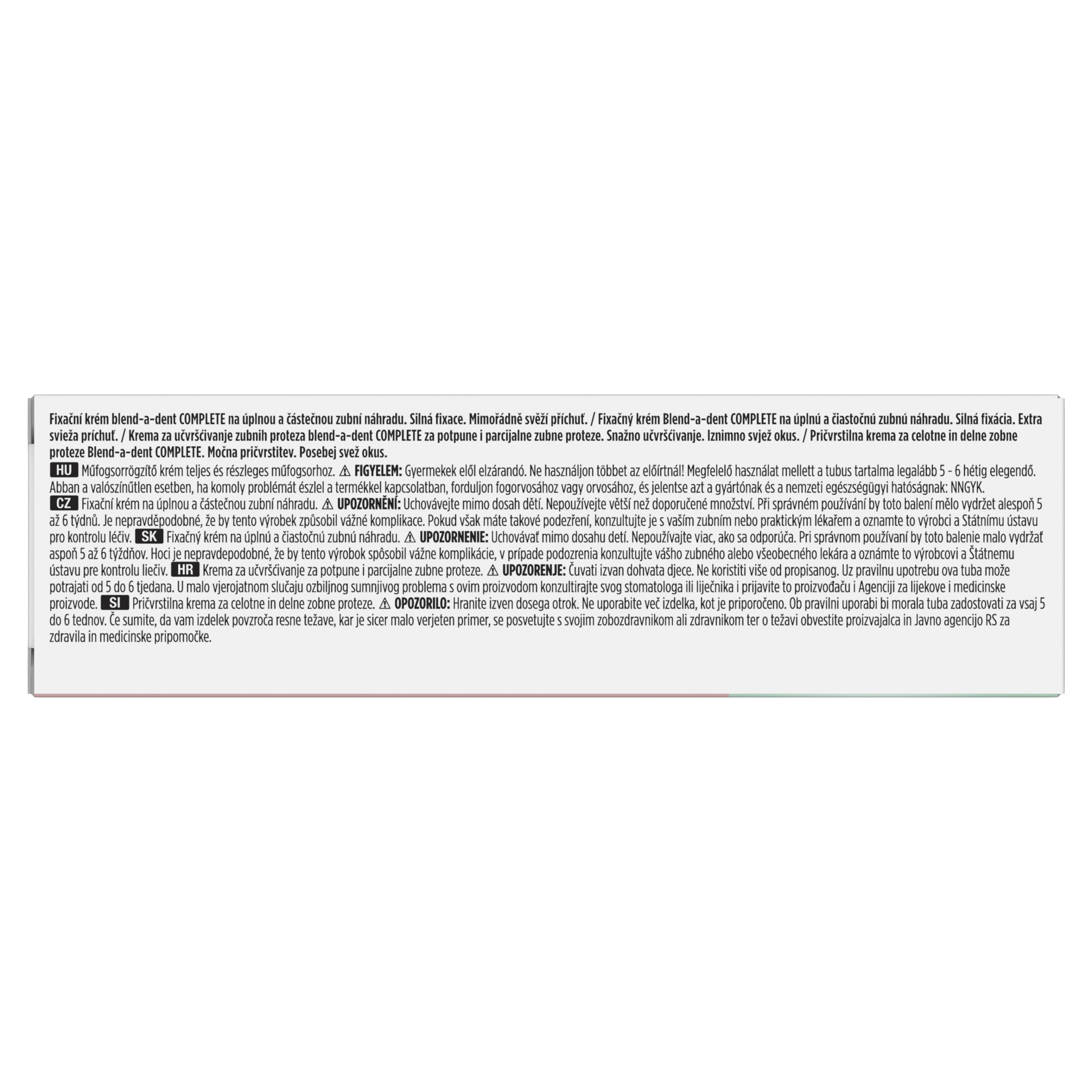 Blend-a-dent Complete čvrsto drži zubnu protezu tijekom dana i čini njezino nošenje ugodnjim tako što djeluje poput jastučića između desni i proteze te stvaranjem nepropusnog sloja pomaže spriječiti upadanje hrane ispod proteze.