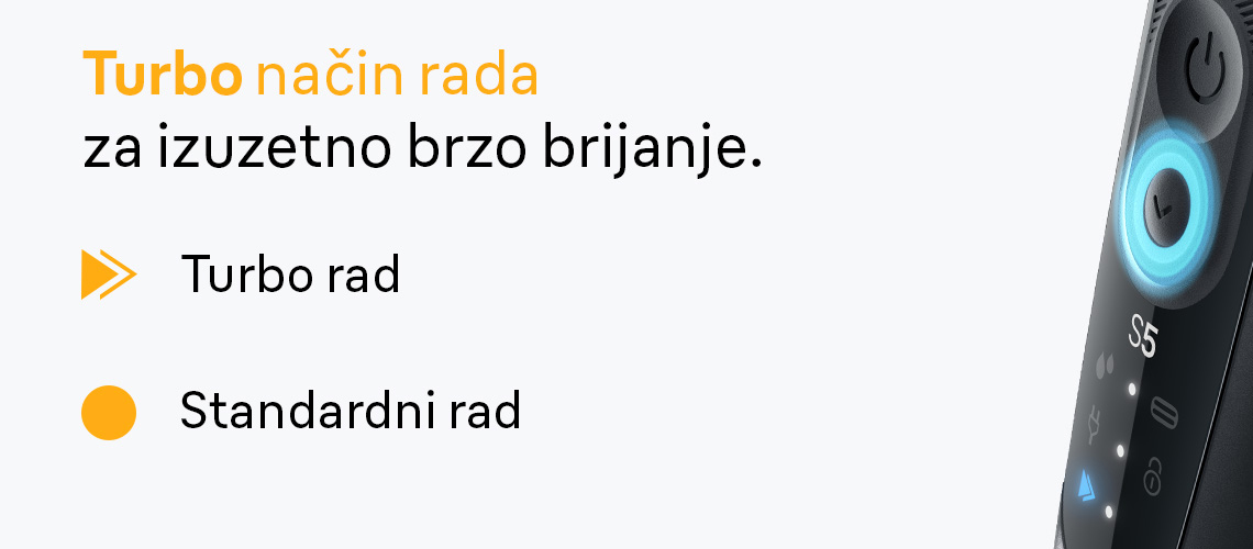 - Odabir između turbo i standardnog načina rada omogućuje personalizaciju brijanja prema vašim potrebama.