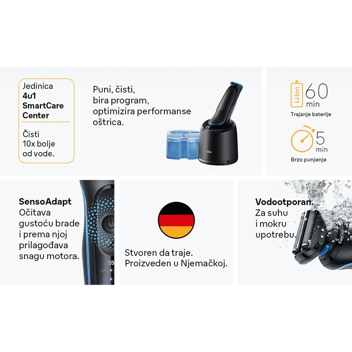 - U kompletu dobivate: 1 brijaći aparat za muškarce Series 5 u crnoj boji s plavim detaljima, 1 jedinicu SmartCare Center s 1 patronom za čišćenje, 1 punjač i 1 četkicu za čišćenje.