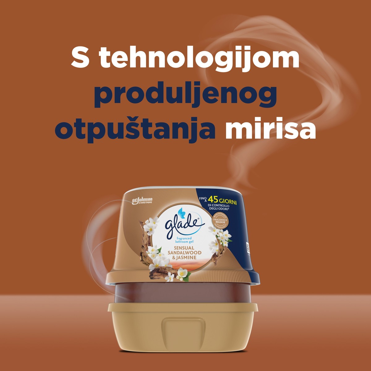 Glade® osvježivač za kupaonicu - jasmin i sandalovina, mirisni je gel za kupaonicu s tehnologijom produljenog otpuštanja mirisa.