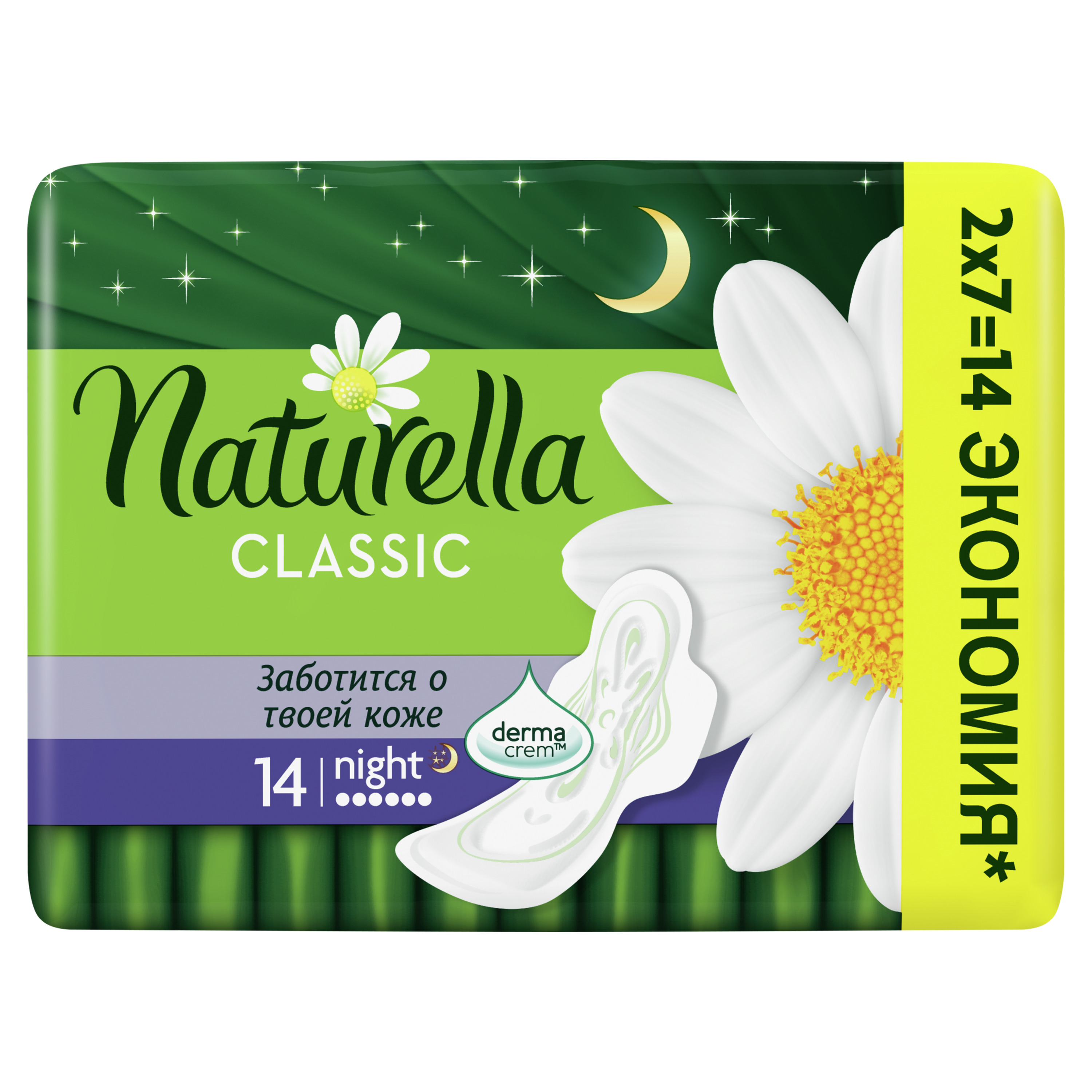 Higijenski ulošci Naturella Classic Night Camomile s krilcima koja drže uložak na mjestu mekani su i za 40 % širi radi dodatne noćne zaštite kod obilnije mjesečnice.