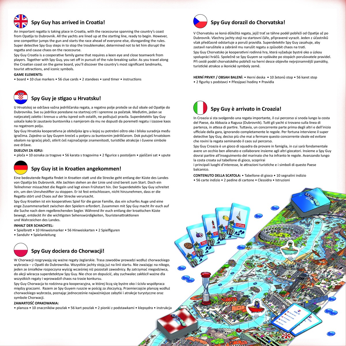 Zajedno sa Spy Guyem krećeš u potjeru za buntovnim jedriličarom. Dok putuješ hrvatskom obalom na igraćoj ploči, otkrit ćeš najznačajnije znamenitosti, turističke atrakcije i čuvene simbole ove države.